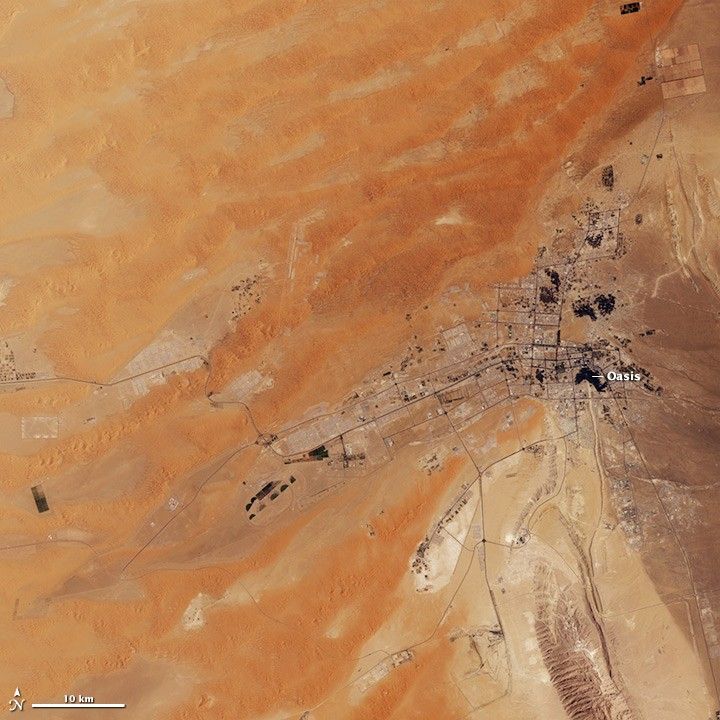 In 1984, green areas were mostly limited to the large oasis in the historic center of the city. By 2015, several new parks, farms, nature preserves, and palace gardens had emerged, particularly to the south and west of the city. As noted in one recent study, the city now contains 12 million square meters of green space—an average of 32 square meters (344 square feet) per resident, more than any other city in the Arab world. The population has expanded rapidly as well, rising from about 50,000 people in 1975 to more than 630,000 in 2012. The expansion of urban areas—gray in the images—has primarily proceeded westward from the city center due to an abundance of open space and the presence of transportation, water, and power infrastructure.