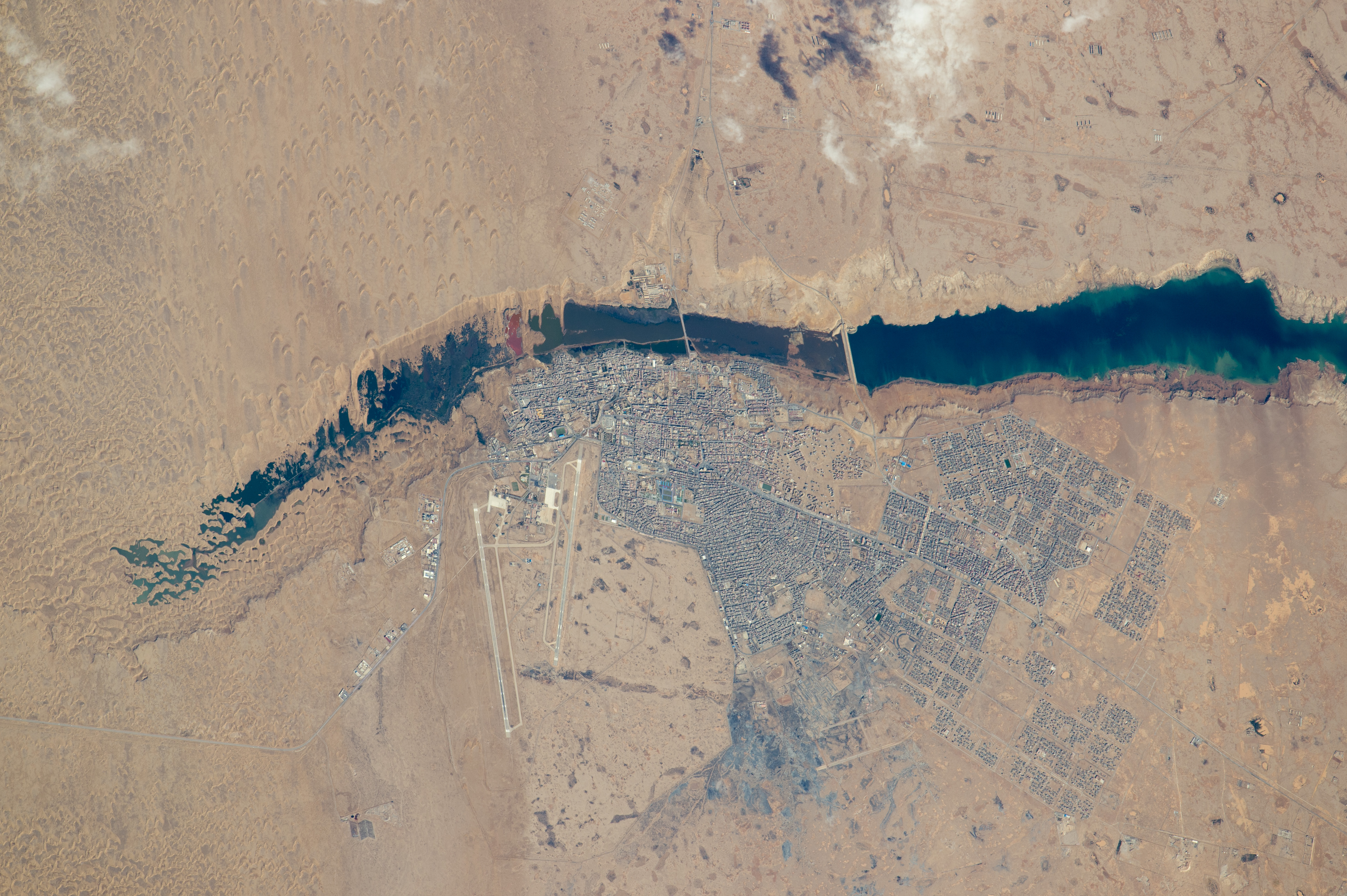 An astronaut aboard the International Space Station (ISS) put his or her earth-observation training to work in recognizing an unusual river that vanishes in a sand field well before it reaches the sea. The Hamra River (As Saquia al Hamra in Arabic) ends about 15 kilometers (9 miles) from the Atlantic Ocean in a dark blue lake. The river has cut into the landscape, making low cliffs on both sides. The river has its source in the mountains 300 kilometers (185 miles) inland, and it provides a persistent water supply for El Aaiún, the biggest city in Western Sahara. One of the most sparsely populated countries in the world, Western Sahara has a population of nearly half a million people; nearly 40 percent of them live in El Aaiún.