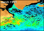 SeaWiFS captured the progression of the North Atlantic Bloom between March and June 1999. Images courtesy of the GSFC Earth Sciences DAAC’s North Atlantic Bloom