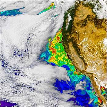 This false-color SeaWiFS image, acquired on October 6, 2002, shows a phytoplankton bloom off the California coast. Blue indicates low chlorophyll concentrations, and yellow and red indicate significantly higher values. Image courtesy of James Acker, Goddard Space Flight Center