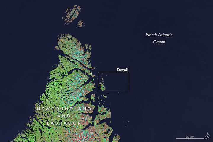 The island is barely a speck on this image captured on July 15, 2014, by the Operational Land Imager (OLI) on Landsat 8. Spanning no more than a pixel or two, Landsat Island is difficult to observe by satellite because clouds often shroud much of the Labrador Sea in the summer, and ice crowds the water in wintertime. With one pass every 16 days, there are very few occasions when a Landsat gets a clear view of the area.