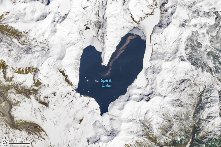 Fishing and swimming are prohibited, and access is limited to preserve the site as a natural laboratory for studying the landscape’s recovery. For example, scientists think that the trees uprooted by the volcanic blast and still floating in the lake, visible as the brown line in the detailed image above, have become an important part of the lake’s ecosystem.