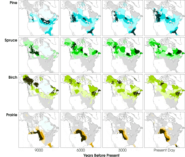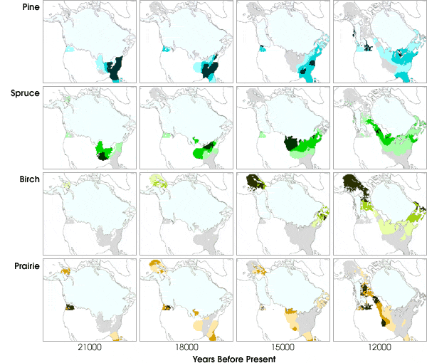 Spruce and pine were found in abundance in the central United States for several thousand years. About 12,000 years ago, the Great Plains began to appear more prairie-like, with spruce and pine retreating northward. (Images courtesy Department of Geological Sciences at Brown University, the National Center for Ecological Analysis and Synthesis, and the Department of Geography at the University of Oregon)