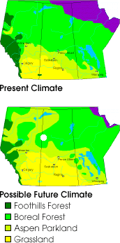 In Western Canada, some scientists are already concerned that the expected warming and drying of the climate will drastically reduce the abundance of aspen, the primary commercial hardwood species in the southern boreal forest. Insufficient moisture could produce an open aspen parkland, where stunted aspen cluster along water courses, with grasslands in between.