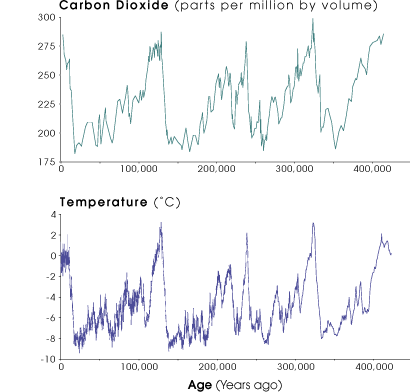 Says Hall, “Ice core studies from Greenland and Antarctica reveal that the Earth’s climate has varied cyclically over the past 450,000 years or so, see-sawing over the plus or minus ten degree range. Temperatures have cycled almost in lockstep with variations in atmospheric carbon dioxide.” As if the Earth is inhaling and exhaling over millennia, carbon dioxide has risen and fallen, ice sheets have advanced and retreated, and vegetation has been forced to adapt. It is this relationship of carbon dioxide and temperature that scientists refer to as the greenhouse effect.