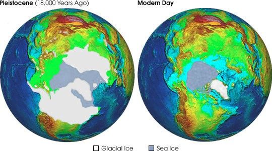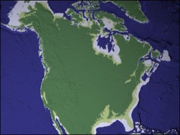 The last glacial advance of the Pleistocene Epoch was also one of its most severe. At its peak about 20,000 years ago, a vast ice sheet called the Laurentide covered much of North America, blanketing Canada and parts of the U.S. with a wall of ice as much as 3.2 kilometers (two miles) thick. While the continents had roughly the same size and shape that they do now, terrestrial biomes were compressed in the remaining ice-free terrain. Vegetation colonized newly exposed areas of coastline that appeared as glaciers consumed more and more of the Earth’s moisture and sea levels began to drop. Many scientists believe that precipitation dropped dramatically during this period—perhaps by as much as 50 percent or more in some regions. The differences between ice age forests and modern forests were probably not just because the ice age was cold, but because it was simultaneously cold and dry.