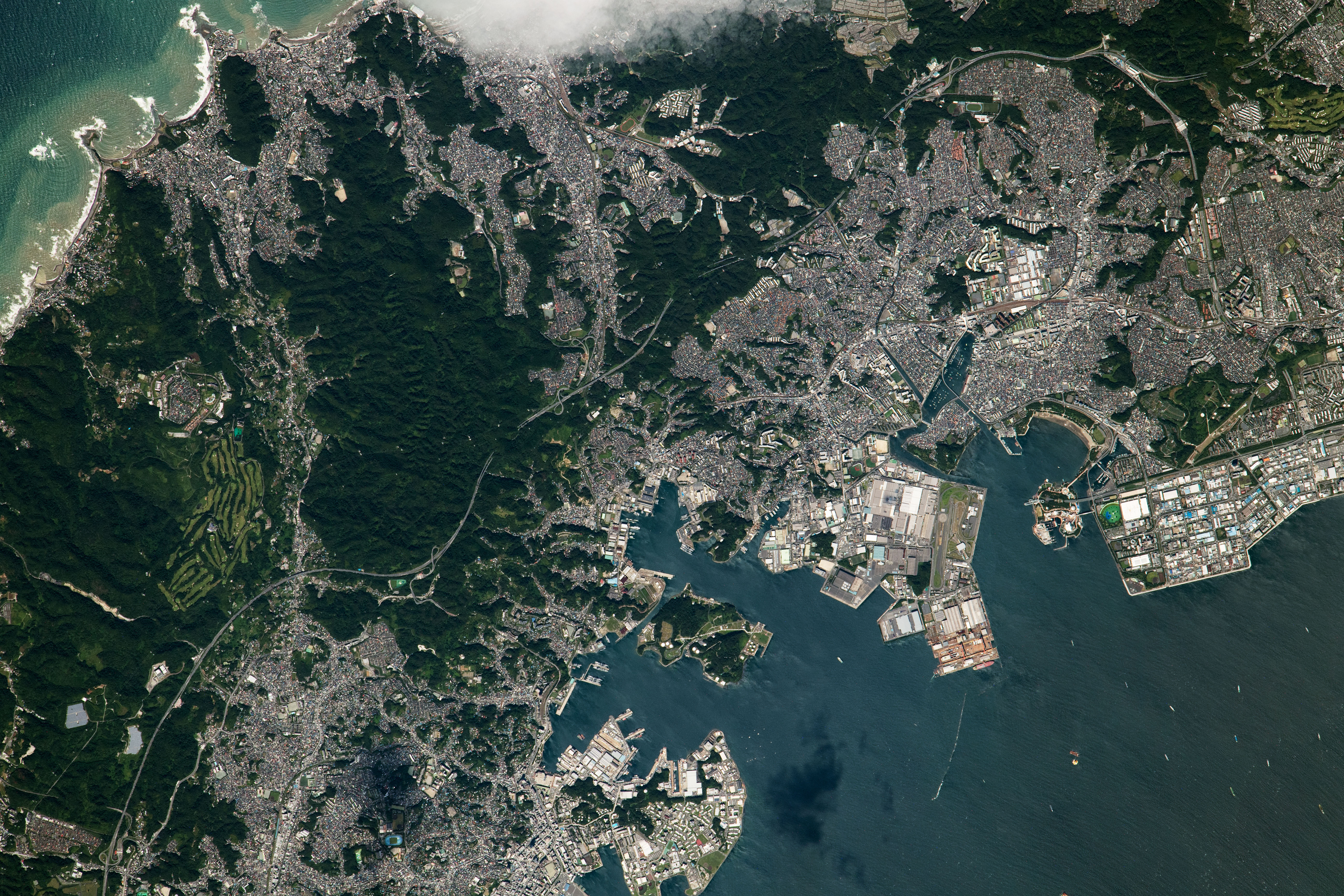Inlets along Sagami Bay are tinged with brown-hued sediment as waves break near the shore. Darker regions near the center of the Miura Peninsula are heavily forested. Mount Ogusu (Ogusuyama), one of the highest points on the peninsula, is neighbored by parks, trails, a golf course, and solar power plants. Along the bottom right of the image, Yokohama and Yokosuka port facilities line the coast and ships linger in Tokyo Bay.