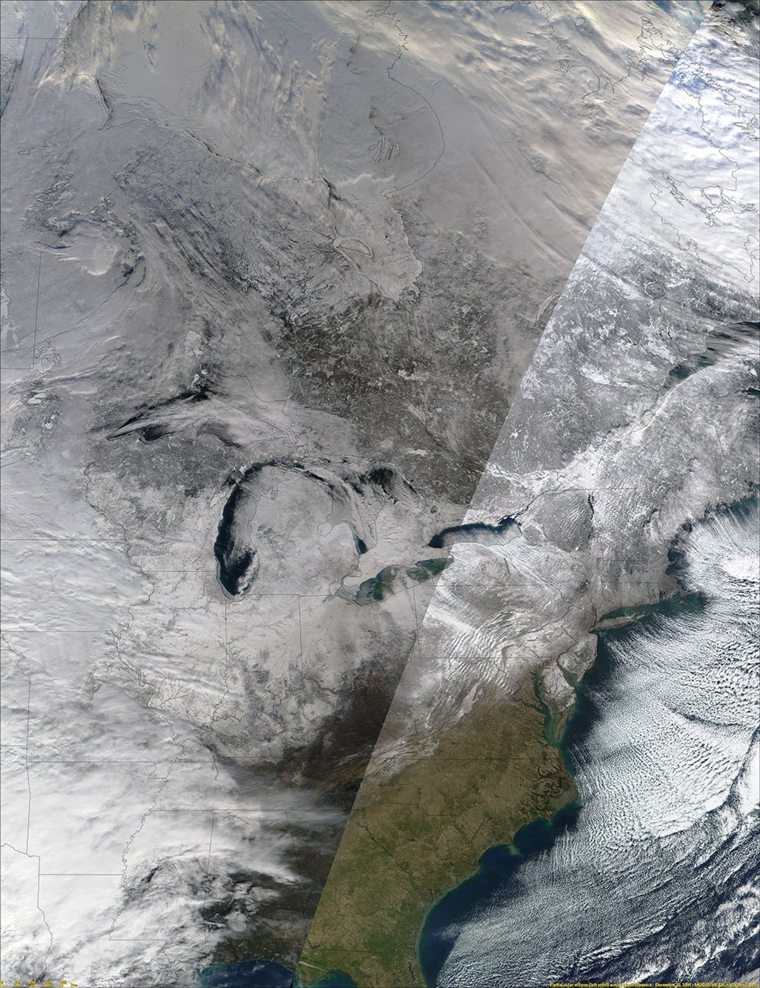 This true-color Moderate-resolution Imaging Spectroradiometer (MODIS)image shows a composite of two adjacent viewing swaths acquired onDecember 25, 2000 in two consecutive overpasses. The scene covers an areafrom the Great Lakes in the north to Georgia toward the south. (The full scene coversfrom Northern Quebec to Florida). Notice thatthe swath on the left side of the image [acquired at 17:30 UTC (12:30 EST)] isconsiderably darker than the swath on the right [acquired at 15:50 UTC (10:50 EST)_eclips]due to the Moon’s shadow.