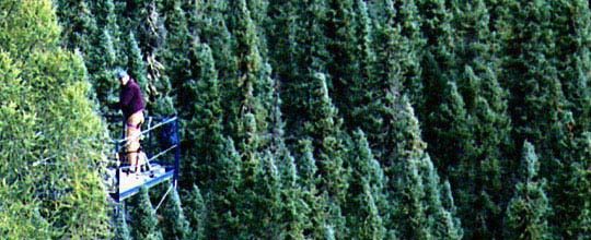 At the old black spruce site in Manitoba, are we already seeing the first sign of the boreal ecosystem’s transition from a net sink to a net source of carbon? In a paper submitted in January 1997 toScience, Wofsy and his colleagues reported that the boreal carbon budget is roughly in balance, but that the boreal ecosystem demonstrates an extreme sensitivity to climate. The net carbon balance at a site is the difference over a year in the amount of carbon dioxide taken up by plant gowth and the carbon dioxide lost through bacterial decomposition of dead limbs, leaves and soil organic matter. For instance, the old black spruce site consistently takes up 800 grams of carbon per square meter per year. But in 1995 it exhaled 890 grams of carbon–a net source of 90 grams per square meter–whereas in 1997 it exhaled 790 grams of carbon–a net source of 10 grams per square meter (Goulden et al. 1998). In short, subtle changes in climate can be the difference between whether the boreal forest is a carbon source or sink; and this difference can show up on a global scale when you consider annual atmospheric carbon dioxide levels.