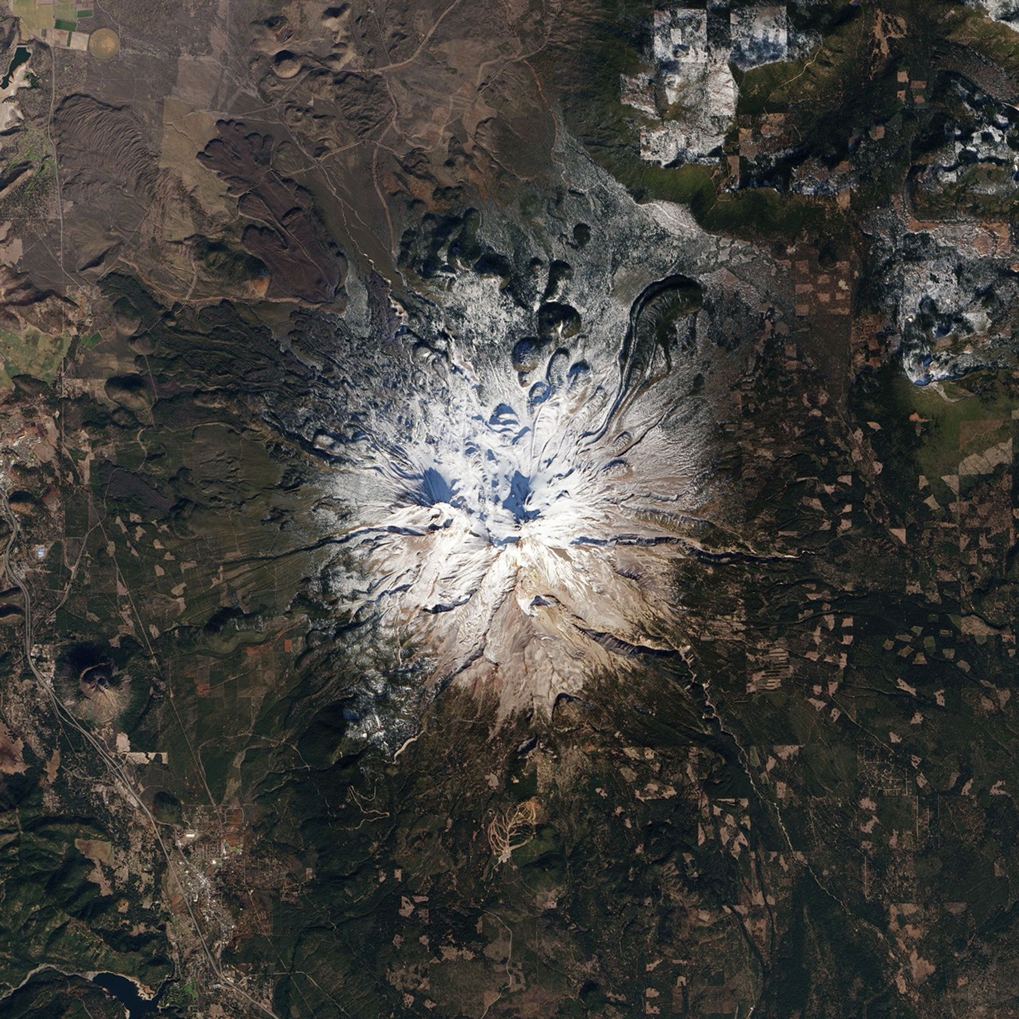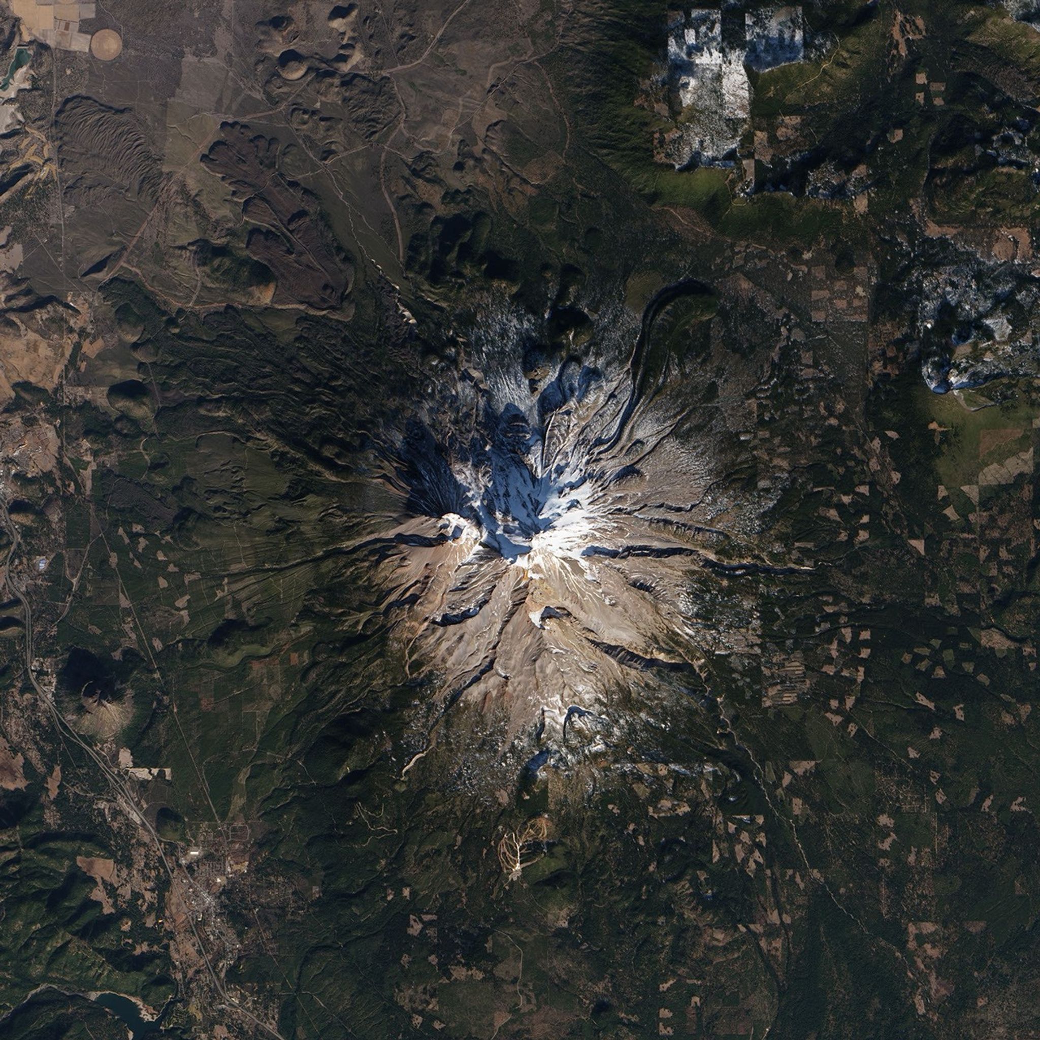 In 2014, nature has been slow to replenish the snowy water supply in many places. The Operational Land Imager (OLI) on the Landsat 8 satellite captured these views of California’s Mount Shasta on January 4, 2014, and November 1, 2013. The southern, eastern, and western slopes of the volcanic mountain have far less snow cover in January than November. (Turn on the image comparison tool to see the difference.) Much of the surrounding landscape looks unchanged between the two scenes, except for longer shadows in January due to the lower angle of the Sun.