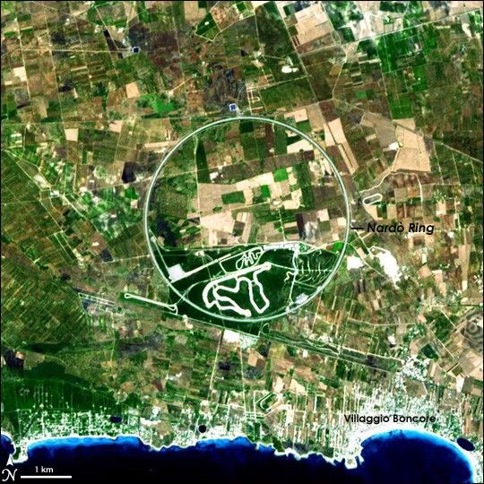 The Nardò Ring is also easy to spot from space, making it a frequent subject of astronaut photography. It also shows up well in satellite images such as this one. The Advanced Spaceborne Thermal Emission and Reflection Radiometer (ASTER) flying on NASA’s Terra satellite captured this cloud-free image of the Nardò Ring on August 17, 2007. The man-made track imposes a white circle on the geometric rectangles of green and tan made by agricultural fields. Several smaller tracks wind through the southernmost section of the ring.