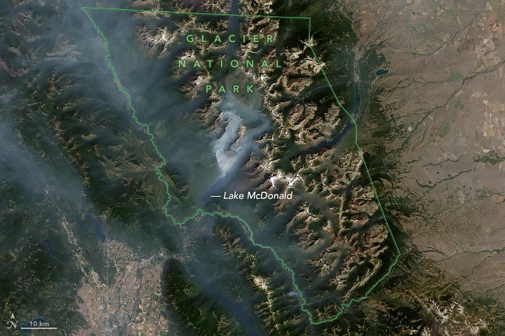 On August 15, the Operational Land Imager (OLI) on Landsat 8 passed over Glacier National Park and acquired the natural-color image above. Several fires are emitting plumes of smoke on the northwestern edge of Lake McDonald. The topography of the park caused the thickest smoke to be found at lower elevations, as the mountains block wind that would otherwise disperse it. A number of fires to the west have lofted large, wide-reaching plumes across the Western U.S. and Canada.