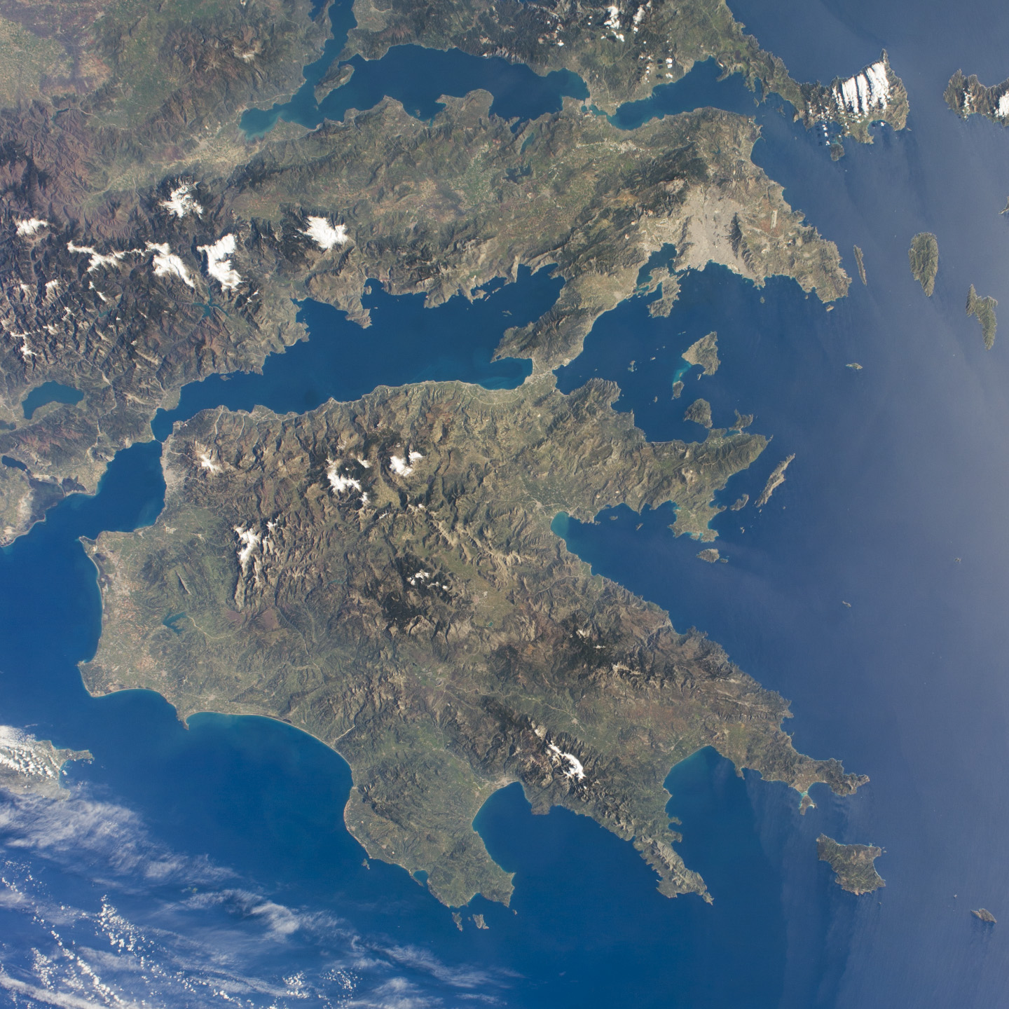 This photo from an astronaut on the International Space Station shows much of the nation of Greece. The urban region of Athens is recognizable due to its size and light tone compared to the surrounding landscape; the smaller cities of Megara and Lamia also stand out. Dark-toned mountains with snow-covered peaks contrast with warmer, greener valleys where agriculture takes place. The intense blue of the Mediterranean Sea fades near the Sun’s reflection point along the right side of the image, and numerous wind streaks in the lee of the islands become visible.