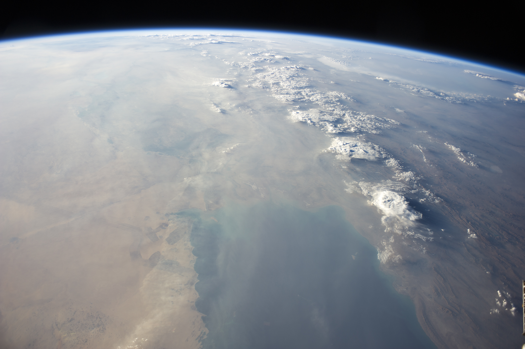 These panoramas taken by astronauts from the International Space Station show the tropical blue waters of the Persian Gulf and then the dust-filled skies as a major dust storm obscures the Gulf and its northern shoreline. Strong north winds often blow across the region in summer, churning up dust from the entire length of the deserts in the Tigris and Euphrates valleys (top left in both images). Dust partly obscures hundreds of kilometers of light-green agricultural lands along these rivers in Iraq (left in both images).