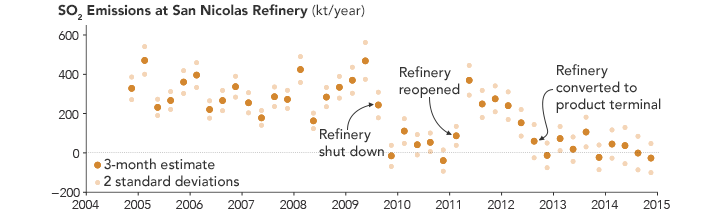 After the San Nicolas refinery halted operations in late 2009, its SO2 output dropped. But by mid-2011, the refinery was reopened and SO2 emissions were back to their previous levels of roughly 350 kilotons per year. When low oil prices caused the refinery to cut back production, emissions follow a downward curve until mid-2013, when the San Nicolas plant was converted to a product terminal. The graph below plots its emissions over the years.