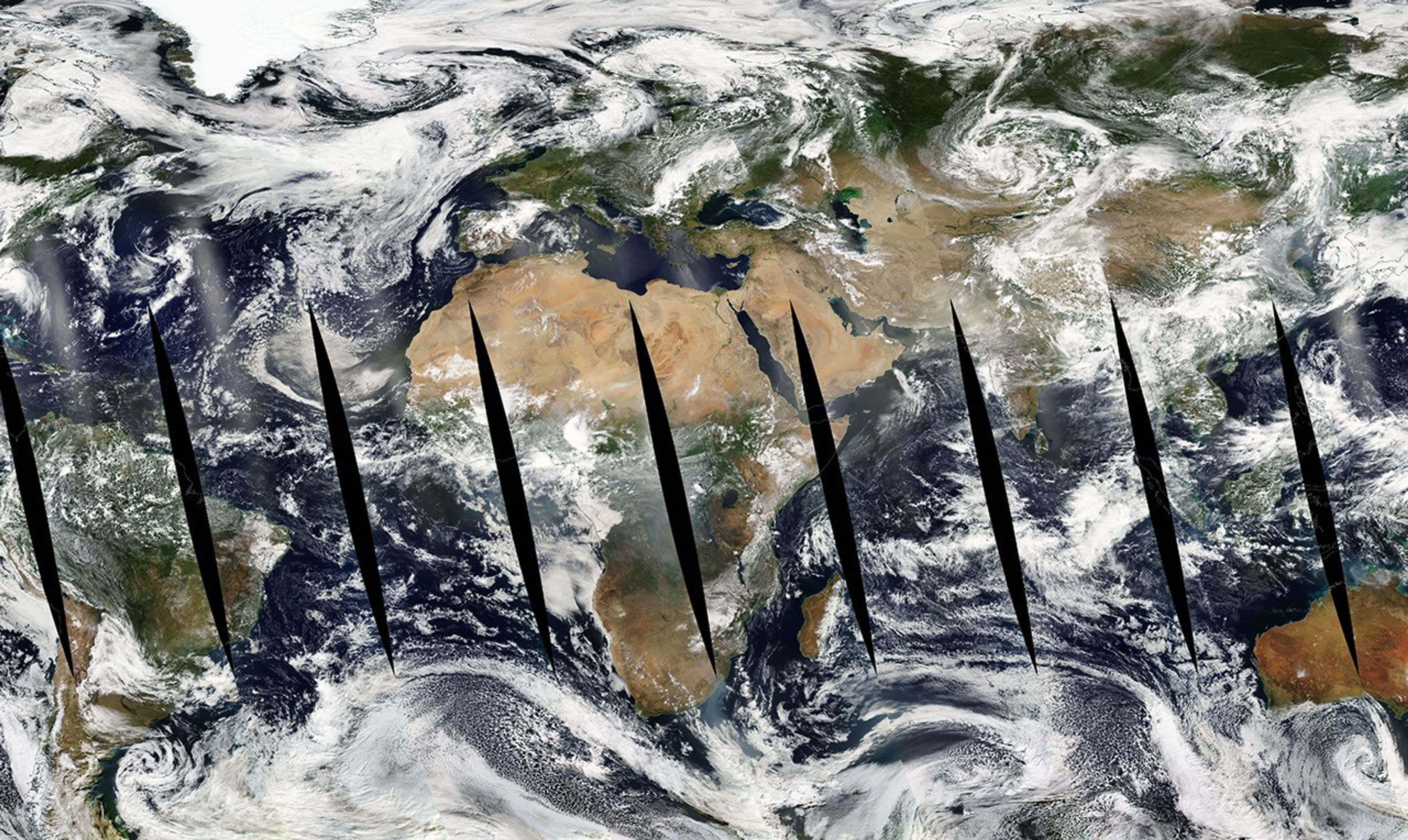 If bodies of water were perfectly smooth, a sequence of nearly perfect reflections of the Sun would appear in a line along the track of the satellite’s orbit. In reality, water surfaces are irregular and often in motion due to waves and currents, so the sunlight gets scattered in many directions and leaves blurry streaks of light in the swaths of satellite data. For instance, notice the strips of sunglint in the mosaic below. All of the data was collected by the Moderate Resolution Imaging Spectroradiometer (MODIS) on NASA’s Aqua satellite on July 3, 2014.