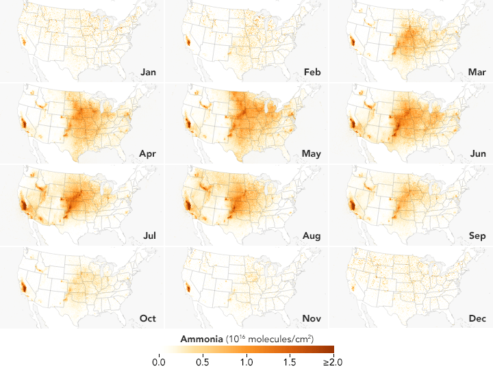 These satellite-based maps of atmospheric ammonia concentrations mostly reflect different source and timing of agricultural emissions. Ammonia concentrations are low in the winter, but they rise rapidly and peak in the spring in parts of the Midwest, Great Plains, and West as farmers sow crops. In areas with many animal feeding operations, concentrations peak in the summer because the gas becomes more volatile as the temperature rises. The San Joaquin Valley in California stands out as one of the most concentrated and persistent ammonia hotspots in the United States. Intensive agricultural activity there is the main source of the ammonia, but the geography of the long, narrow valley exacerbates the problem by making it difficult for winds to clear pollutants away.
