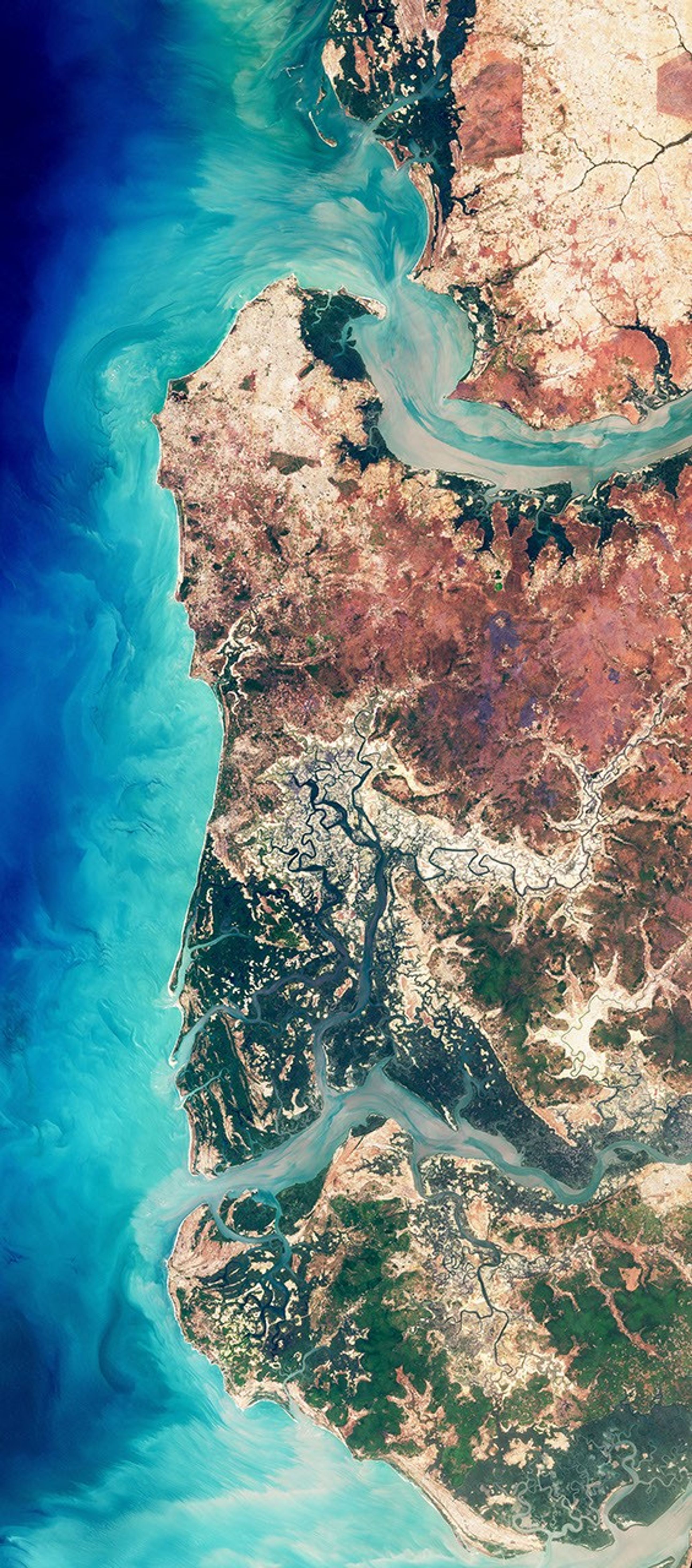 Many of Senegal’s largest rivers are flanked by corridors of green and interlaced with networks of sinuous creeks and streams. These lush green areas are havens for mangroves—short, shrubby trees with waxy leaves and tangles of finger-like roots that rise from shallow tidal areas.