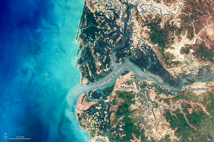 The map above shows how mangrove forests along the Cassamance River changed between 2000 and 2016. The analysis is based on Landsat satellite observations of the “greenness” of vegetation, or the Normalized Difference Vegetation Index (NDVI). Areas marked as gain (teal) had no mangroves in 2000 but measurable growth by 2016. Areas marked as having regenerated (green) had mangroves in 2000 that became significantly greener and denser by 2016. The natural-color image below was acquired by the Operational Land Imager (OLI) on Landsat 8 on March 5, 2018.