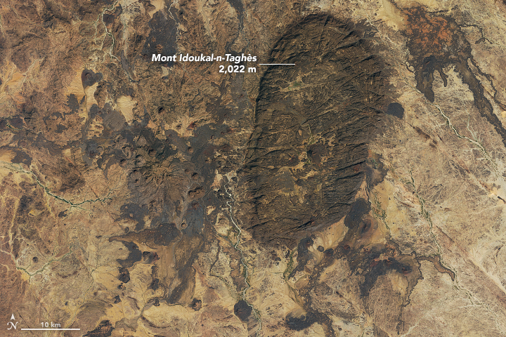 The natural-color image above shows a few of the ring dike structures that enclose granite massifs. The image was acquired by the Operational Land Imager (OLI) on the Landsat 8 satellite on October 31, 2018. The scene highlights the stark contrast between the mountains and the surrounding lowlands, such as the Ténéré Desert to the west. In total, the Aïr Mountains extend across 84,000 square kilometers (32,000 square miles) and include the tallest peaks in Niger.