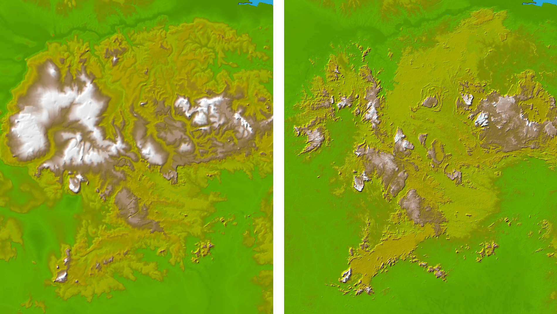 These two images show exactly the same area in South America, the Guiana Highlands straddling the borders of Venezuela, Guyana and Brazil. The image on the top was created using the best global topographic data set previously available, the U.S. Geological Survey’s GTOPO30. In contrast, the image on the bottom was generated with a new data set recently released by the Shuttle Radar Topography Mission (SRTM) called SRTM30, which represents a significant improvement in our knowledge of the topography of much of the world.