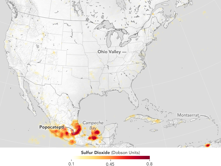 OMI detected more sulfur dioxide over Mexico in 2016 than in 2005, according to the researchers. However, the mix of sources in Mexico makes it more difficult to understand the change. In 2017, Carn authored a study indicating that degassing at Popocatépetl had roughly doubled the volcano’s emissions. (Note: Degassing is a constant process that occurs even when a volcano is not actively erupting).