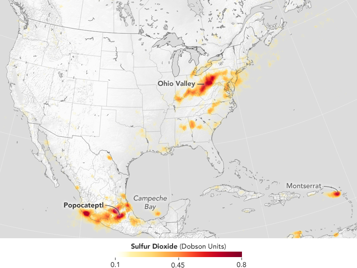 Major sulfur dioxide sources in Mexico include several power plants in western Mexico, oil infrastructure in and along the Bay of Campeche, and active volcanoes. In particular, Popocatépetl, which is just 70 kilometers (40 miles) from Mexico City, is near several power plants and oil refineries. “There are very few places in the world where such strong anthropogenic and volcanic sulfur dioxide sources are so close together,” noted Simon Carn of Michigan Tech.