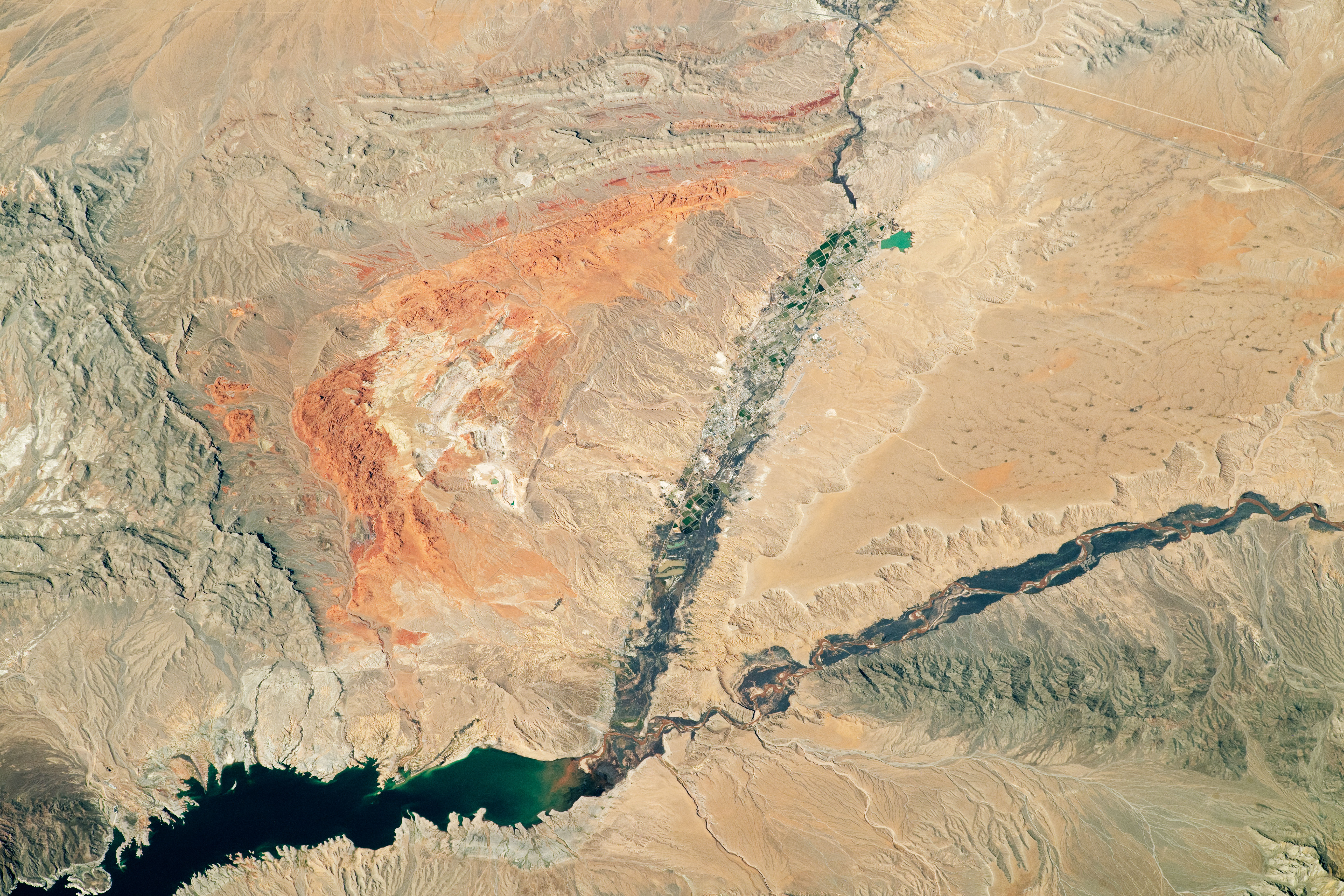 While in orbit over southern Nevada, an astronaut onboard the International Space Station took this photo of brightly colored rocks and deep canyons in the Mojave Desert.