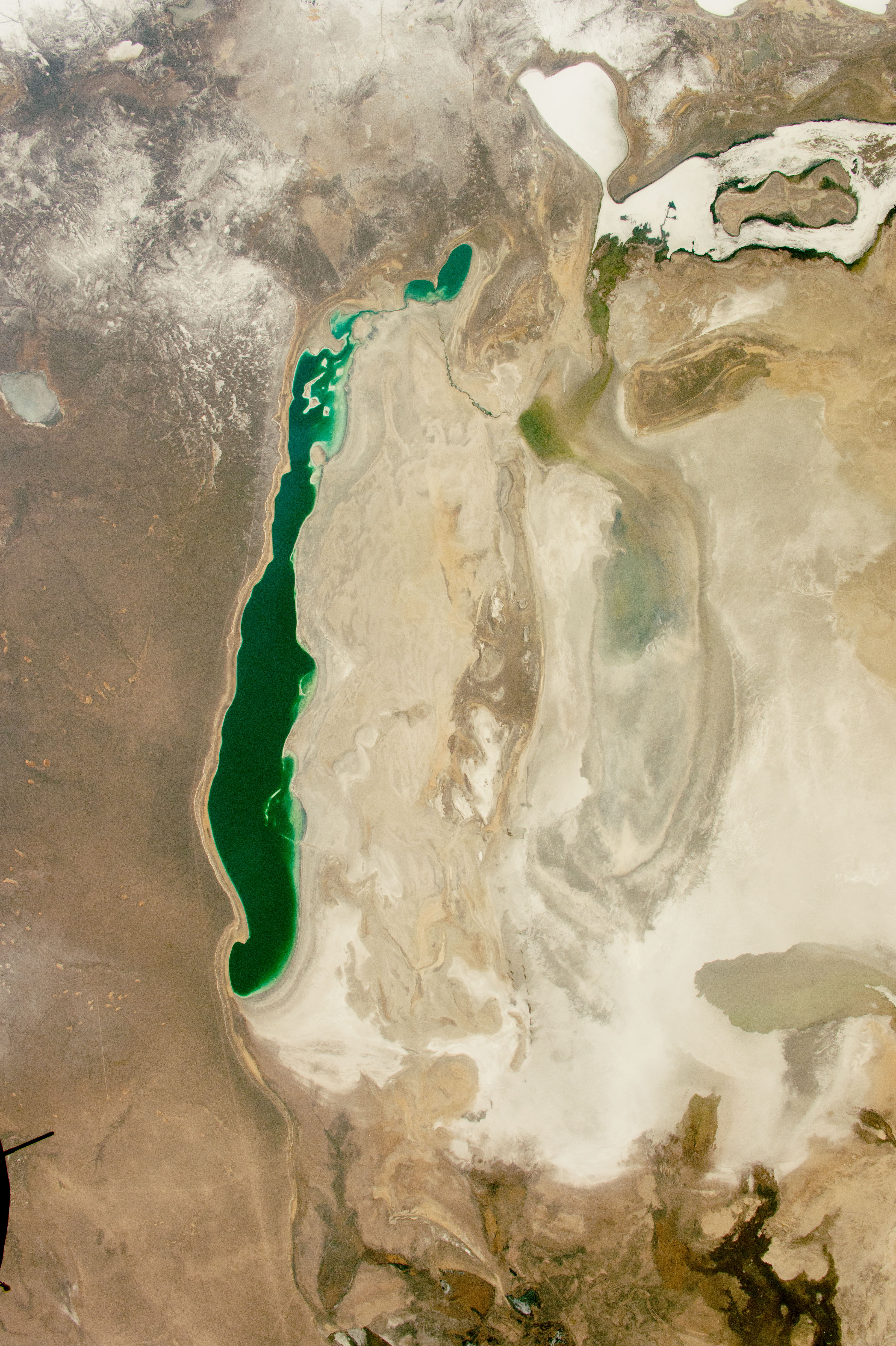 This pair of photographs, taken from the International Space Station, highlights this tendency. The image on the left was taken on March 8, 2017, when water levels in the eastern lobe were relatively low. At the time, much of the surface water in the region was spread across northern Kazakhstan as snow.