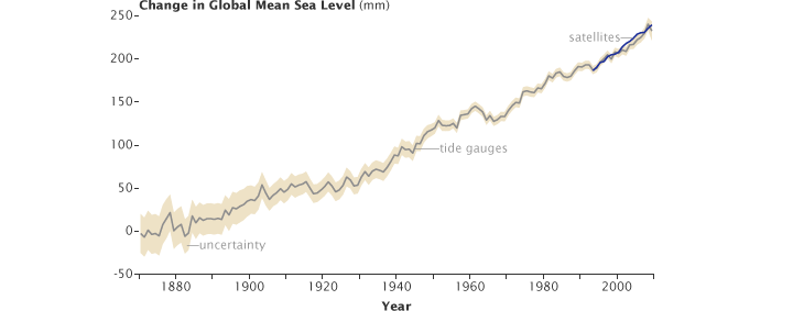 In the case of the oceans, the continual excess of evaporation versus precipitation would eventually leave the oceans empty if they were not being replenished by additional means. Not only are they being replenished, largely through runoff from the land areas, but over the past 100 years, they have been over-replenished: sea level around the globe has risen approximately 17 centimeters over the course of the twentieth century.