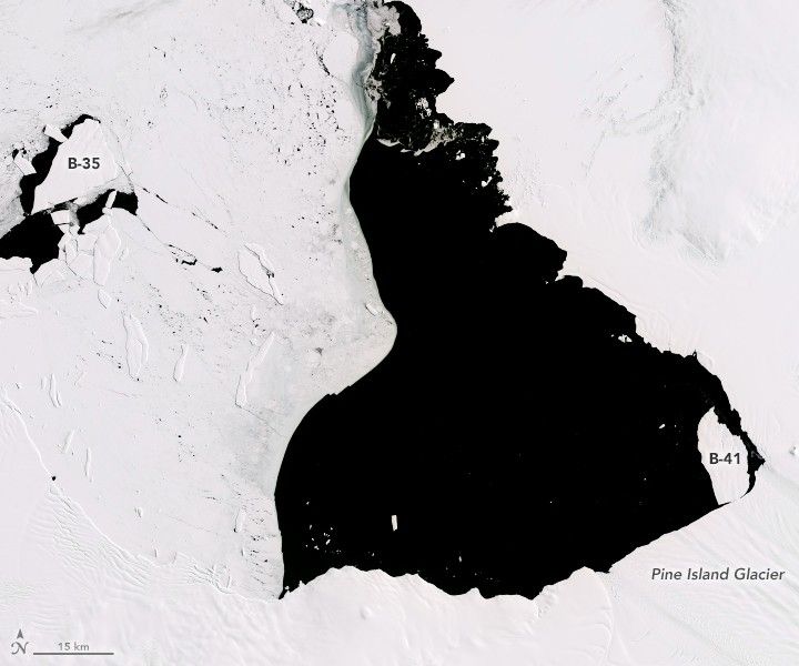 In August 2015, the U.S. National Ice Center reported that a calving event had occurred in the darkness of winter, likely in late July. The event produced a number of sizeable icebergs including B-41, which was still close to the shelf when this image was acquired on November 26, 2015. B-35 had drifted farther from the ice front.