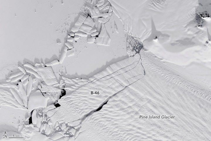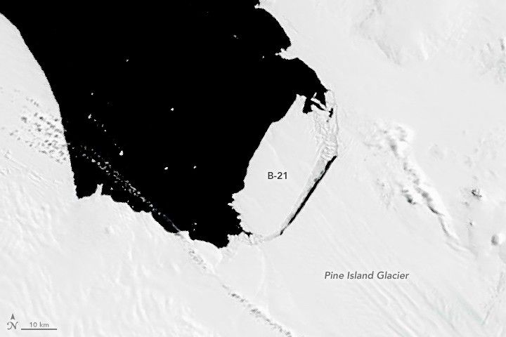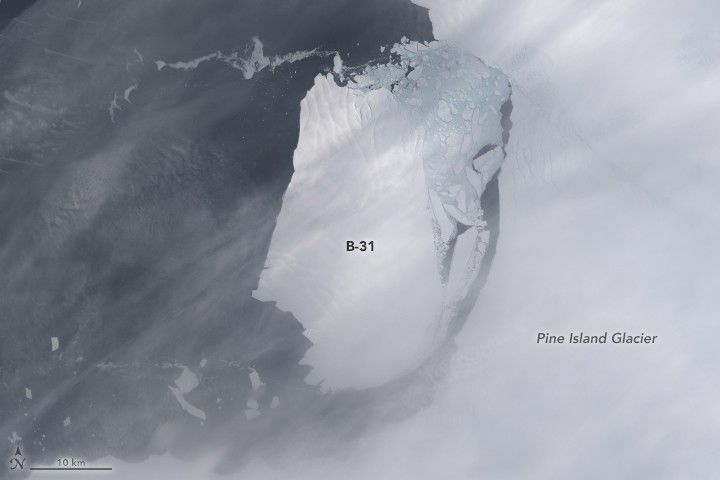 Sometime between November 9 and November 11, 2013, a large iceberg separated from the front of Pine Island Glacier. Landsat 8 captured this view on November 13, 2013. The berg, named B-31, measured 700 square kilometers.