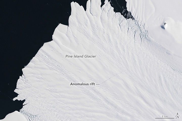 Researchers reported anomalous rifts forming between 2013 and 2015 on Pine Island Glacier. Unlike previous cracks, these originated from the center of the glacier and propagated outward toward the margins. The pattern indicated stresses at the center of the ice shelf. The cracks, like the one visible in this image from March 8, 2015, were a precursor to further retreat of the ice front.