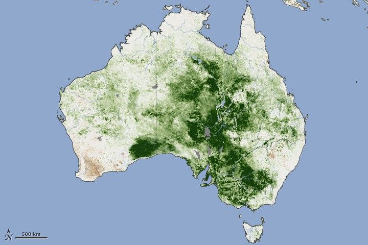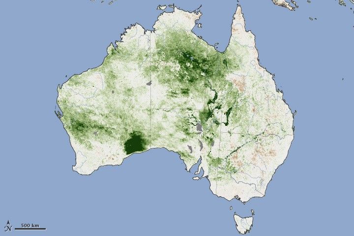 What happened to all of the plants during the winter? They are still there, but the satellite now sees fewer green, photosynthesizing leaves. And all that dead or dry plant matter could fuel fires. In fact, emergency authorities in Australia are warning residents that the risk of grassland fires is very high this year. Fuel loads may reach their highest levels in 30 years, said news reports. Though not as hot or intense as forest fires, grass fires spread very quickly and can be erratic, making them extremely dangerous.