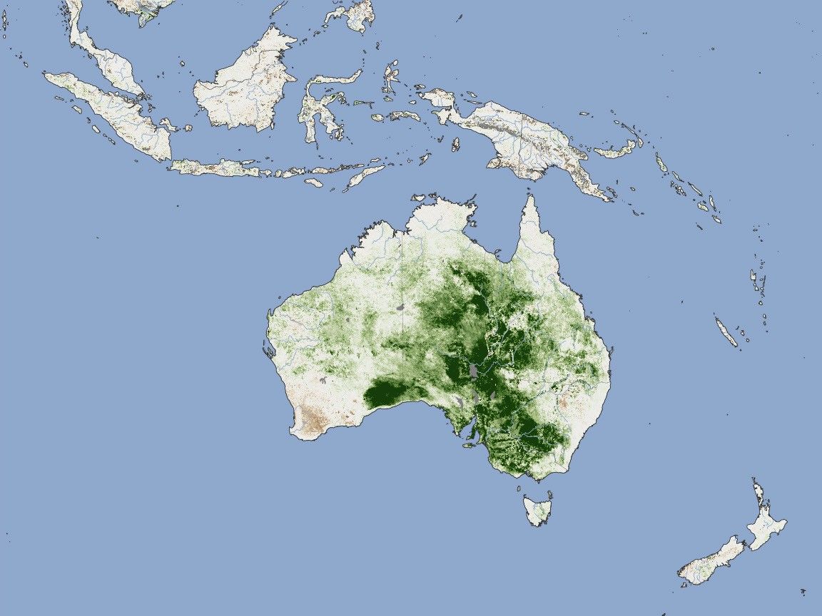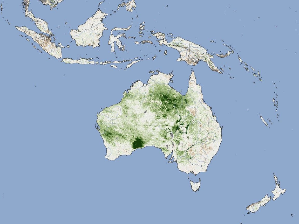 The measurement is an indication of how dense and leafy plants are and how much photosynthesis is going on. In April, Australia was covered with much denser growth than normal as thick grasses grew, especially in the interior of the country. Growth was still high in September, but conditions were closer to average in many areas.