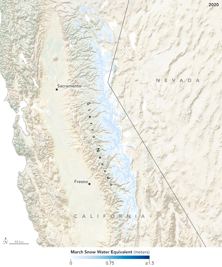 The maps below show snow-water equivalents across the Sierra Nevada in early March for each year between 2015 and 2020. Data for the maps, developed by the University of Colorado’s Center for Water, Earth Science, and Technology, are derived from ground-based data, computer models, and satellite imagery. They incorporate a data set from the Jet Propulsion Laboratory (JPL) called the MODIS Snow Covered Area and Grain-size (MODSCAG), which uses data from NASA’s Terra satellite to determine properties of the snow—things like the area covered, grain size, and albedo—that are useful for deriving accurate estimates of snow-water equivalent.