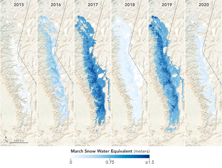 The maps below show snow-water equivalents across the Sierra Nevada in early March for each year between 2015 and 2020. Data for the maps, developed by the University of Colorado’s Center for Water, Earth Science, and Technology, are derived from ground-based data, computer models, and satellite imagery. They incorporate a data set from the Jet Propulsion Laboratory (JPL) called the MODIS Snow Covered Area and Grain-size (MODSCAG), which uses data from NASA’s Terra satellite to determine properties of the snow—things like the area covered, grain size, and albedo—that are useful for deriving accurate estimates of snow-water equivalent.