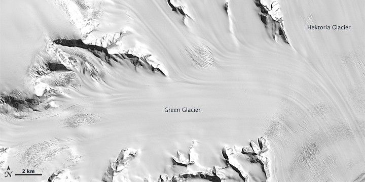Some of the most dramatic changes in recent years have occurred at Hektoria and Green glaciers, tributaries on the northern edge of Larsen B drainage basin. Between 2002 and 2006, the two glaciers lost an average of 4.2 gigatons of ice per year; between 2006 and 2011, they lost 5.6 gigatons per year. In their lower reaches, the two glaciers have lost about 220 meters (720 feet) of vertical thickness since 2002.