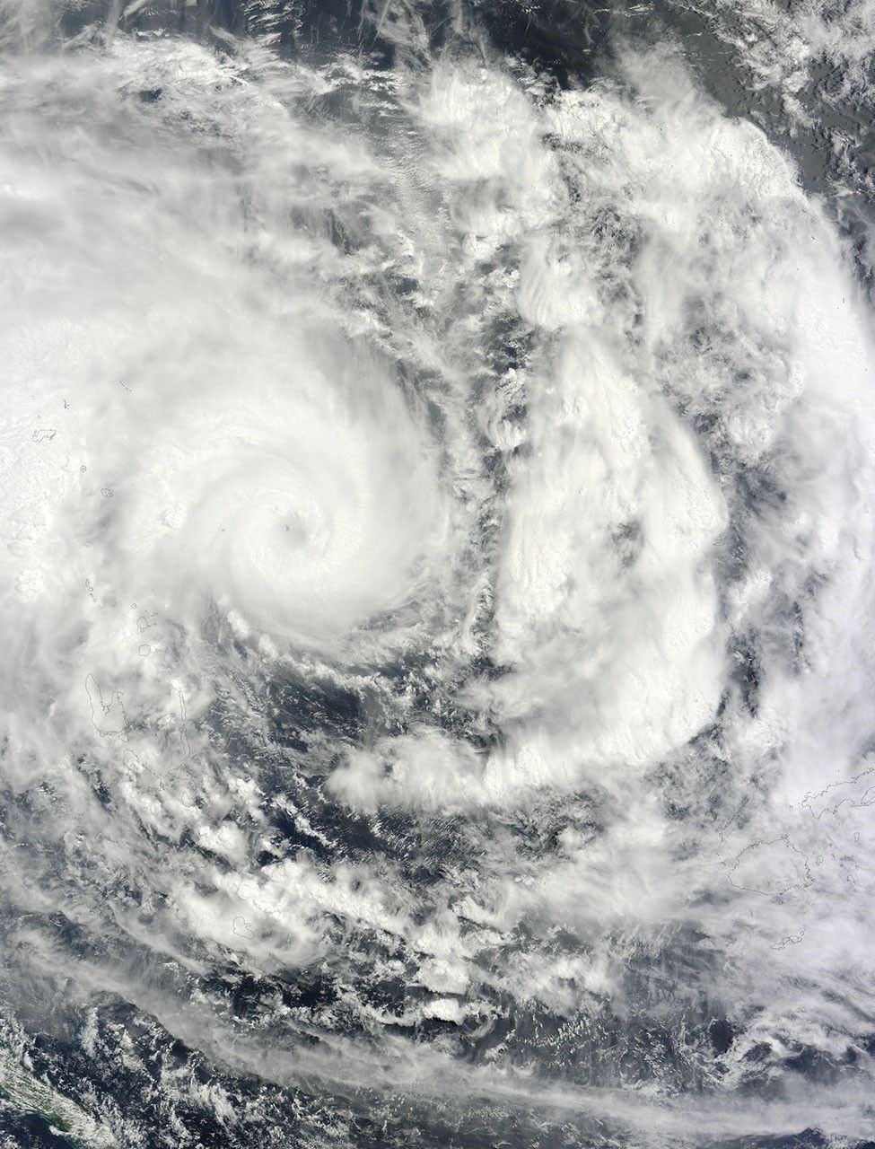 The Moderate Resolution Imaging Spectroradiometer (MODIS) on NASA’s Terra satellite, captured this view of Cyclone Pam (top) on March 11, 2015, at 22:50 UTC as it neared the island chain of Vanuatu. In a mosaic (bottom image) also captured on March 11, Pam and two other storms—Nathan and Olwyn—were lined up in a row north of the continent. The mosaic is based on data collected during three orbital passes of the Visible Infrared Imaging Radiometer Suite (VIIRS) on Suomi NPP. (The MODIS on Terra acquired similar imagery later that day.)