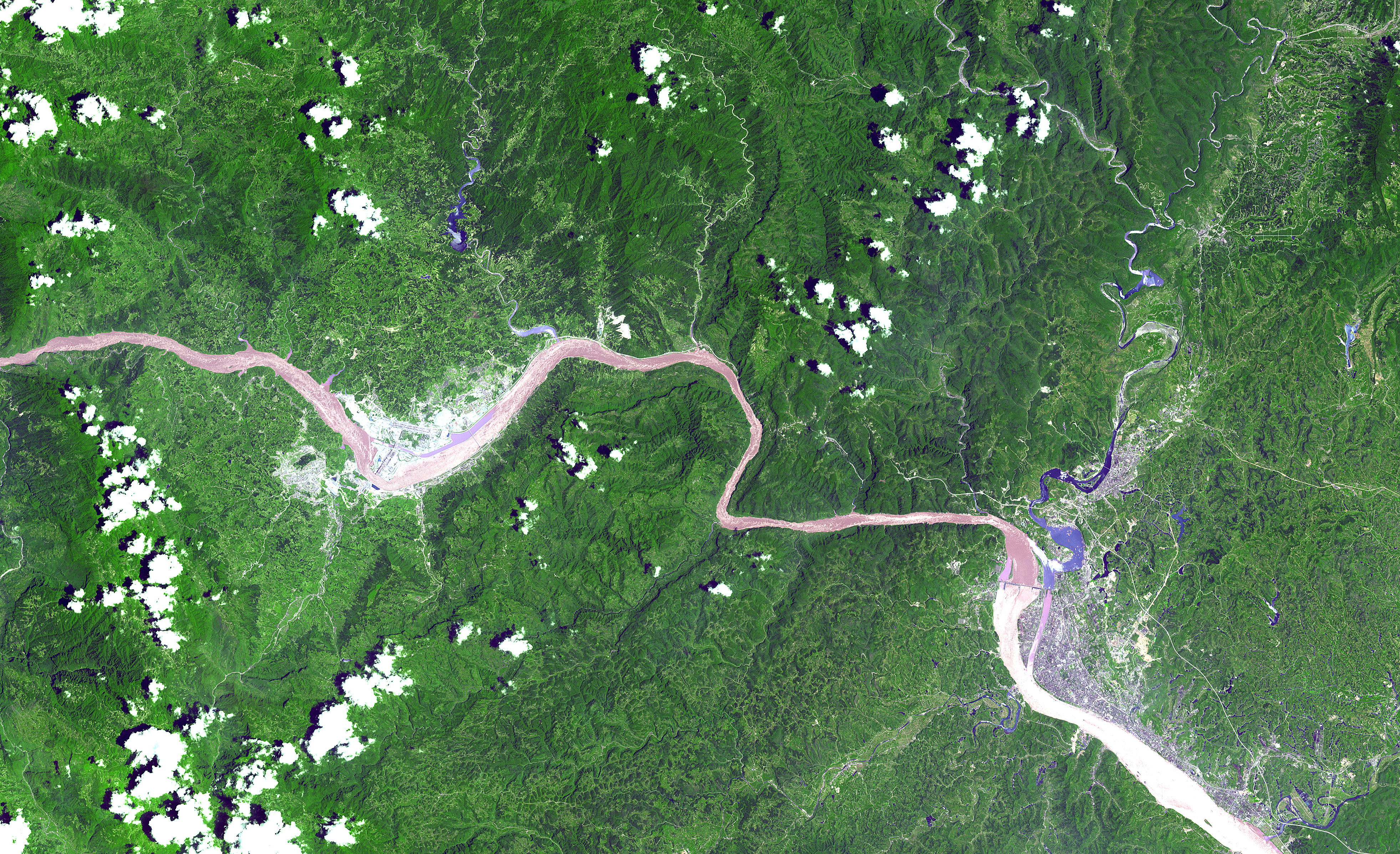 The above image shows a 60-kilometer stretch of the Yangtze River in China. In the image, one can see the Xiling Gorge, which is the easternmost of the three big gorges along the Yangtze. The construction site of the Three Gorges Dam, slated to be the world’s largest, sits on the left-hand side of the image along the big bend in the river. The dam is being built in part to control flooding along the Yangtze.