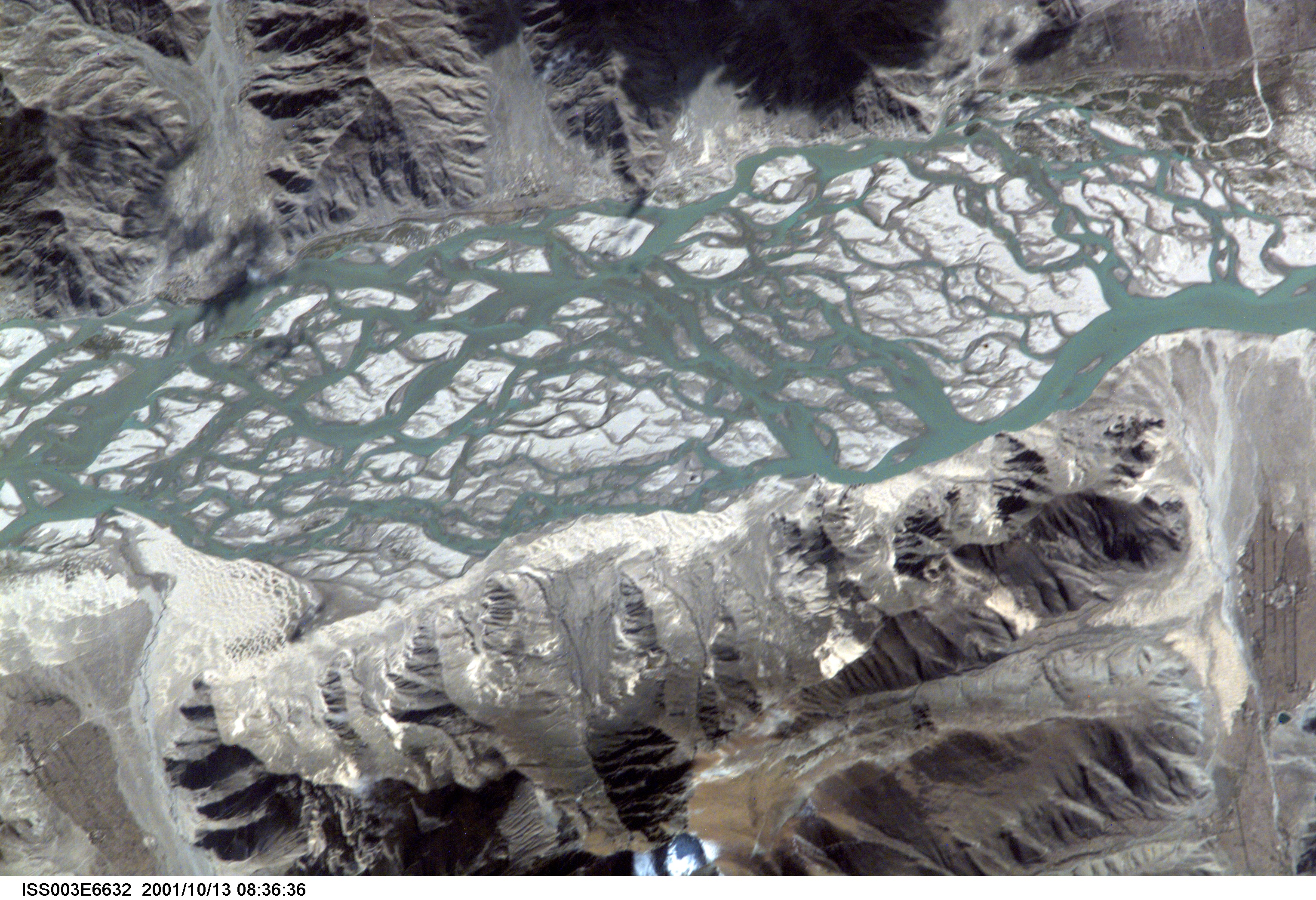 On October 13, 2000, the Expedition 3 crew of the International Space Station, high over Tibet, took this interesting photo of the Brahmaputra River. This mighty Asian river carves a narrow west-east valley between the Tibetan Plateau to the north and the Himalaya Mountains to the south, as it rushes eastward for more than 1500 km in southwestern China. This 15-km stretch is situated about 35 km south of the ancient Tibetan capital of Lhasa where the river flow becomes intricately braided as it works and reworks its way through extensive deposits of erosional material. This pattern is indicative of a combination heavy sediment discharge from tributaries and reduction of the river’s flow from either a change in gradient or perhaps even climate conditions over the watershed.