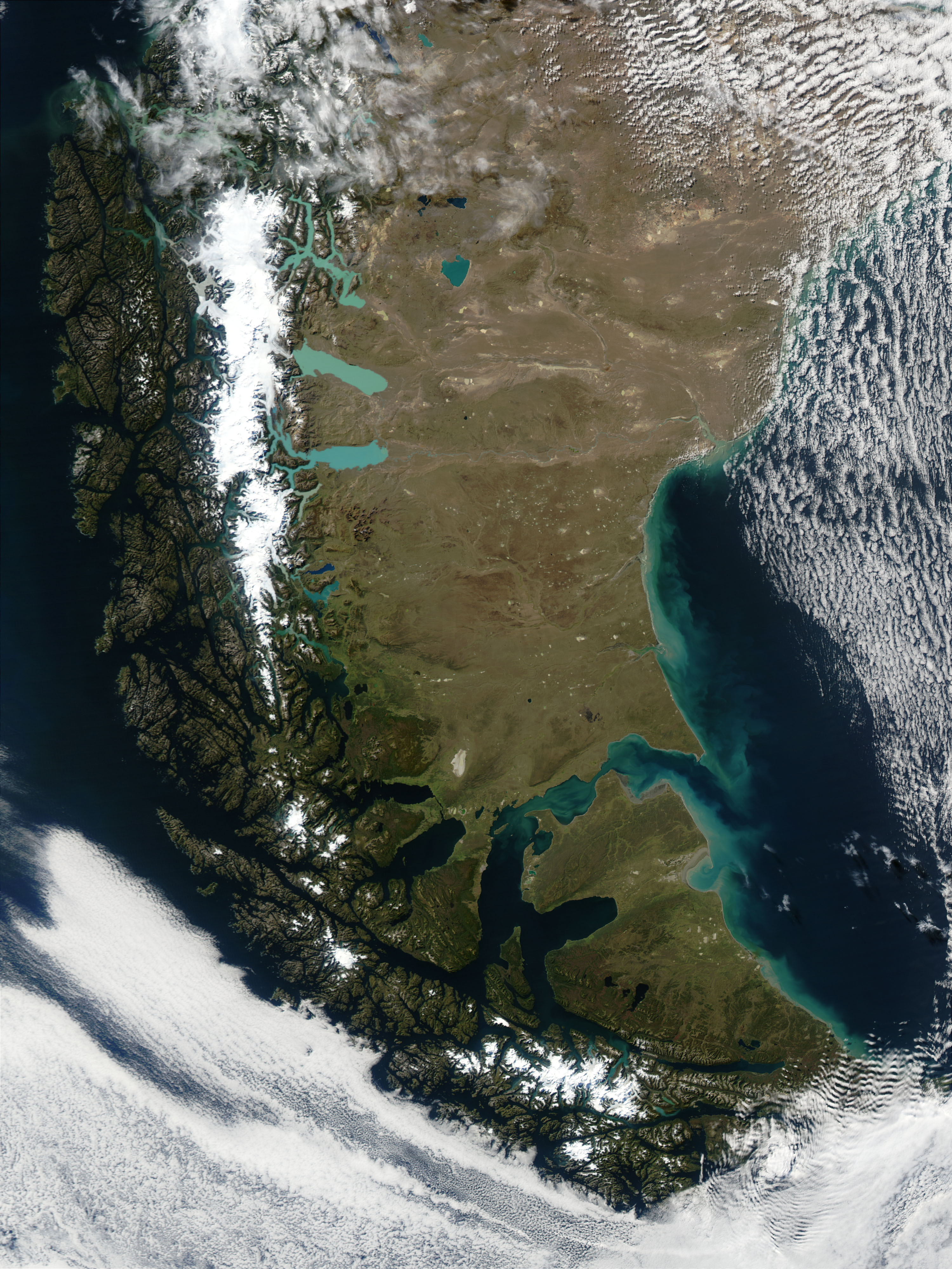 The Tierra del Fuego—a group of islands at the southern tip of South America—have some of the worst weather in the world. The rugged islands poke into the ocean current circling Antarctica, and are almost continuously battered by high winds and covered by clouds. On March 28, 2003—an early fall day in the Southern Hemisphere—the Moderate Resolution Imaging Spectroradiometer (MODIS) instrument aboard NASA’s Terra satellite captured this rare view of the islands and the Patagonia region of South America. Even in this image, however, Cape Horn, the southernmost point on the continent, remains cloudy.