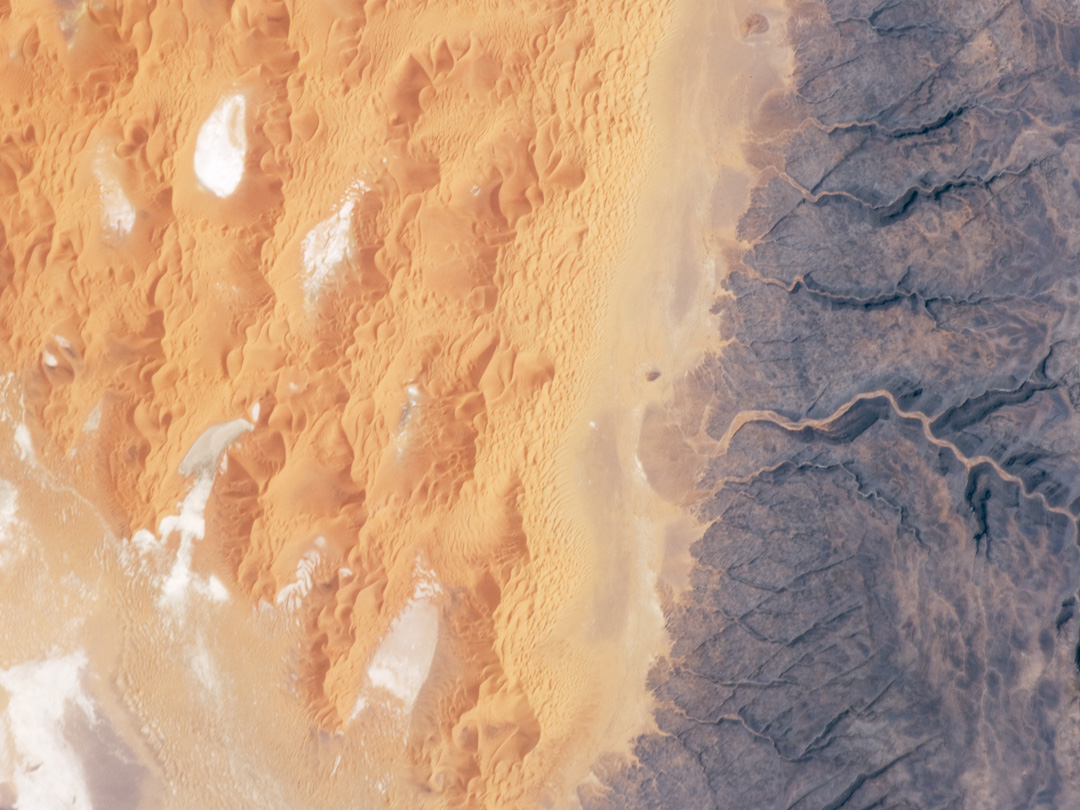 The Tifernine Dune Field is located at the southernmost tip of the Grand Erg Oriental, a “dune sea” that occupies a large portion of the Sahara Desert in eastern Algeria. This astronaut photograph illustrates the interface between the yellow-orange sand dunes of the field and dark brown consolidated rocks of the Tinrhert Plateau to the south and east (image right). Three distinct landforms are visible in the image, each providing information about past and present climate in the area.