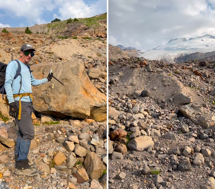 Hiking up toward the glacier, Pelto pointed out where the ice had been in recent years. He paused at a large boulder, and he motioned toward it with his ice axe (below-left). “I sat on that rock and put my crampons on, with one foot on the ice, in 1990.” Today, in 2024, the ice was 2,000 feet (600 meters) uphill from that spot (below-right).