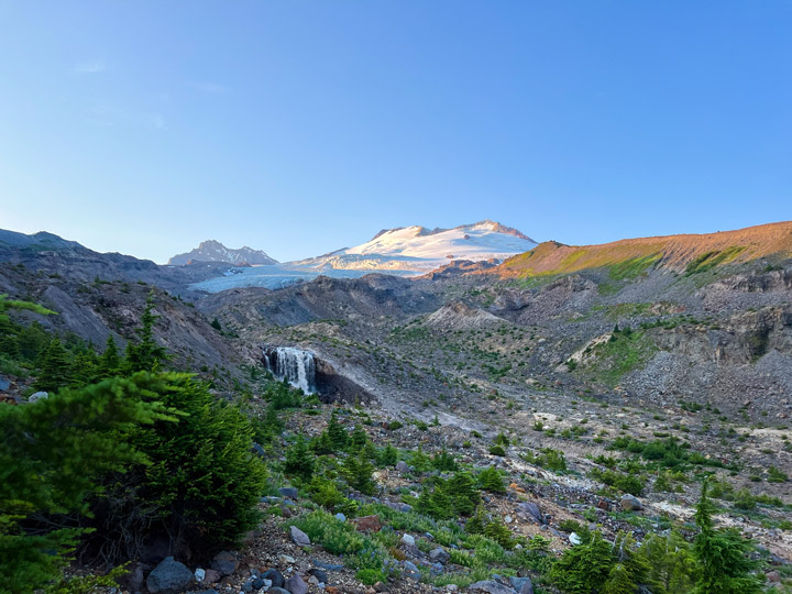 The raw landscape downslope of Easton Glacier is hummocky and treacherously uneven, with loose piles of rock that have only recently been exposed by melting ice. The valley is rimmed on both sides with steep slopes that rise to a crisp edge. These are a third type of moraine, lateral moraines, marking where the sides of the glacier would have been 175 years ago during the Little Ice Age. One such moraine is visible as the sharp ridgeline on the right side of the photo above.