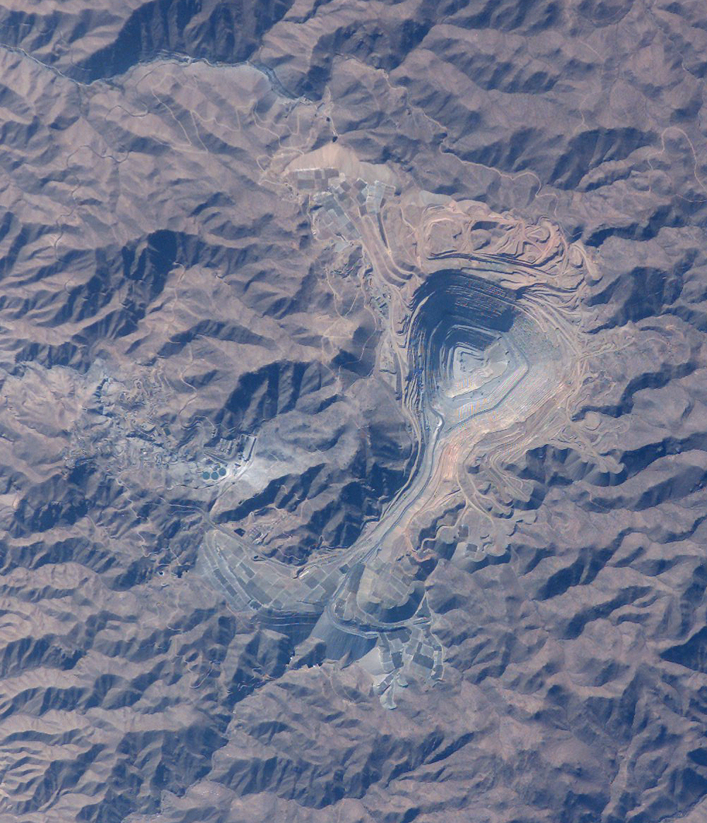 The rugged, mineral-rich Andes support some of the world’s biggest mines (gold, silver, copper, and more). This image looks down the bull’s-eye of Peru’s Toquepala copper mine, a steep sided and stepped open-pit mine. Mid-afternoon sunlight on the arid slopes of the central Andes mountains provides an accent to the mine contours. At the surface the open pit is 2.5 kilometers across, and it descends more than 700 meters into the earth. A dark line on the wall of the pit is the main access road to the bottom. Spoil dumps of material mined from the pit are arranged in tiers along the northwest lip of the pit. Numerous angular leaching fields appear lower right, and the railroad to the coast is a line that exits the image center left. The railroad was built to export Toquepala’s copper and connects the coastal port of Ilo, 95 kilometers to the southwest.