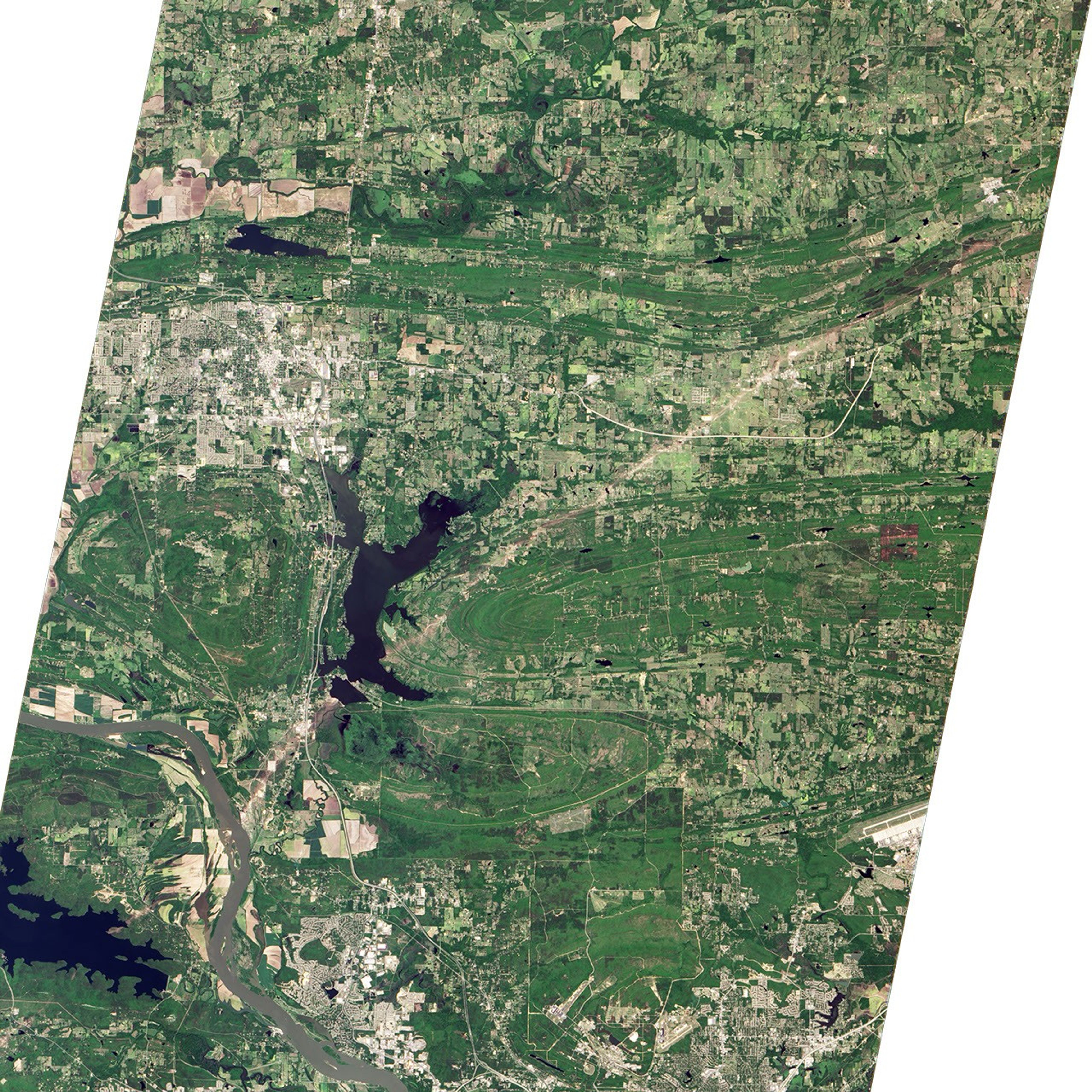 At MODIS resolution, the entire town of Mayflower is barely distinguishable; but at ALI’s top resolution of 10 meters per pixel, it is possible to distinguish between individual buildings. In this ALI image, a trail of damaged trees and homes is visible near Interstate 40. The storm moved in a northeasterly direction, hitting the southern part of Mayflower first, then crossing I-40, and flattening neighborhoods along the shore of Lake Conway. The aerial image below, taken by meteorologists from the National Weather Service’s Little Rock office, shows damaged homes along Lake Conway.
