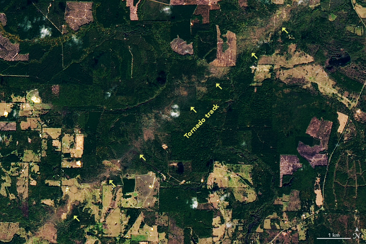 According to the National Weather Service’s Damage Assessment Toolkit, the tornado produced winds that reached speeds as high as 170 miles (270 kilometers) per hour. The twister destroyed large numbers of homes, peeled the roof off a factory, flattened a church, and snapped and uprooted trees along a track that extended 58 miles (93 kilometers). Dozens of people were injured and some were killed, according to news reports. Idabel, Oklahoma, (visible in this broader image) was among the hardest-hit towns, with at least 100 homes and businesses taking damage.