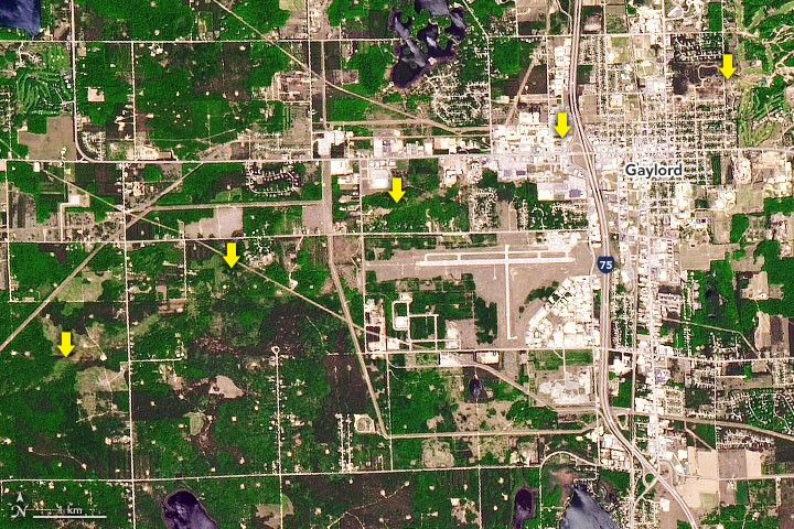 The Operational Land Imager (OLI) on Landsat 8 captured natural-color images (above) of Gaylord on June 2, 2022, and May 31, 2021. The map below is based on optical differences between those two images, with the area around the track highlighted to emphasize its location.