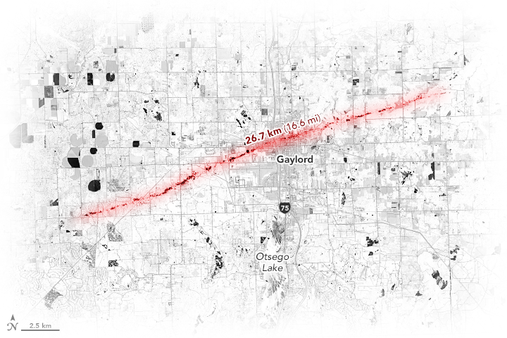 The line of destruction spanned 16.6 miles, cutting across forests, farmland, Gaylord’s commercial district, and residential neighborhoods. According to news reports, the tornado killed two people and injured 44 as it decimated a mobile home park, tore off roofs, and tossed vehicles. Preliminary estimates indicate that the storm caused several million dollars in damage.